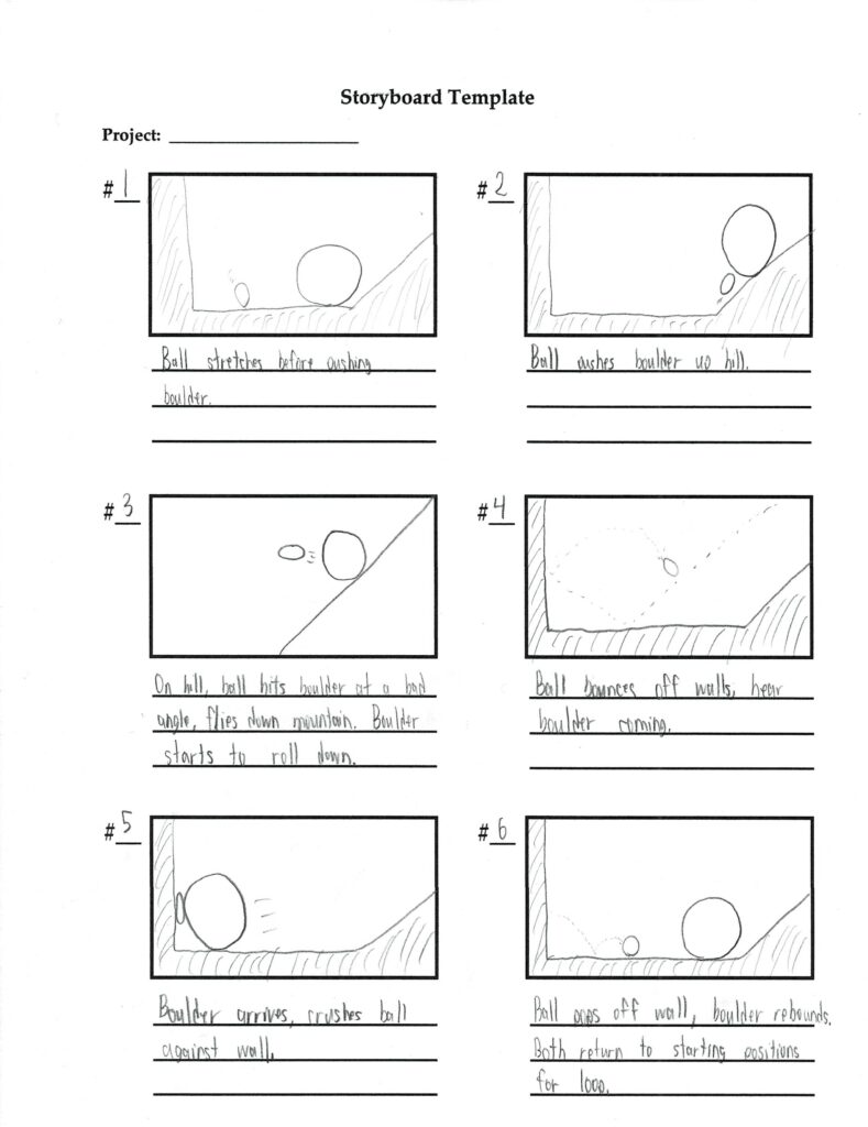 The action of the animation is limited to a single position. However, this is used to emphasize and help the viewer predict the next events. The ball and the boulder are placed roughly at the 1/3 and 2/3 points on the screen to emphasize the main actors in the animation. The boulder is rolled up the hill and off the screen to the right. There are several seconds where nothing is occurring on screen to add some tension, before the ball plummets back into the frame. This is used to show that the ball is no longer in control of the boulder, and that the actors are definitely subject to gravity in this world. This helps to prepare the viewer for the boulder’s return and subsequent smashing of the ball.