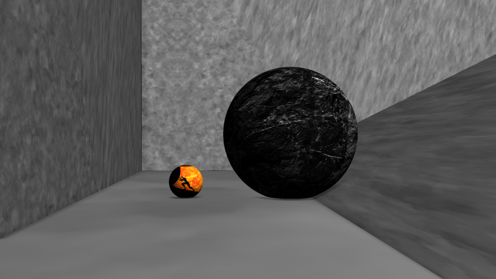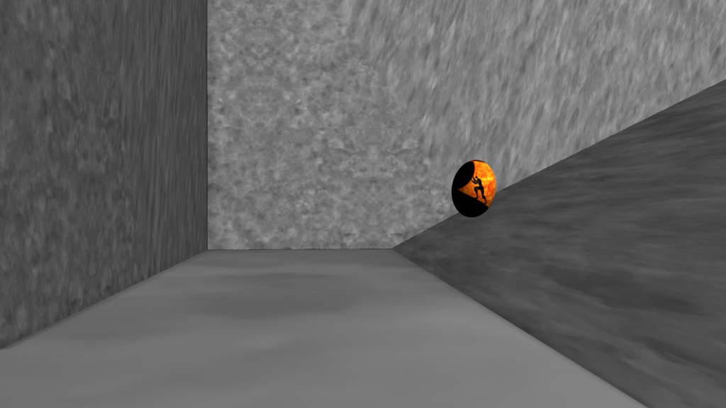 This animation is inspired by the Greek myth of Sisyphus, who is punished and forced to roll a boulder up a hill forever. Here, the bouncy ball takes the role of Sisyphus. The ball stretches, then begins to roll the ball up the hill. The ball and boulder are both rolled offscreen, but the attempt clearly fails, as the ball comes tumbling back into frame, followed by the boulder, crushing the ball. Then, the animation loops as the ball begins another attempt.
